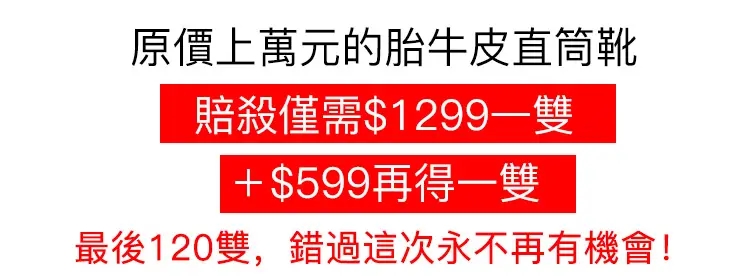 4分鐘前【30年老鞋廠結業】原價上萬元的胎牛皮直筒靴【賠殺僅NT$1299一雙,+599再得一雙!】最後120雙!減齡小圓頭,日常百搭,細腿利器! - 【破殺價】+599 NT$1898免運到手2雙